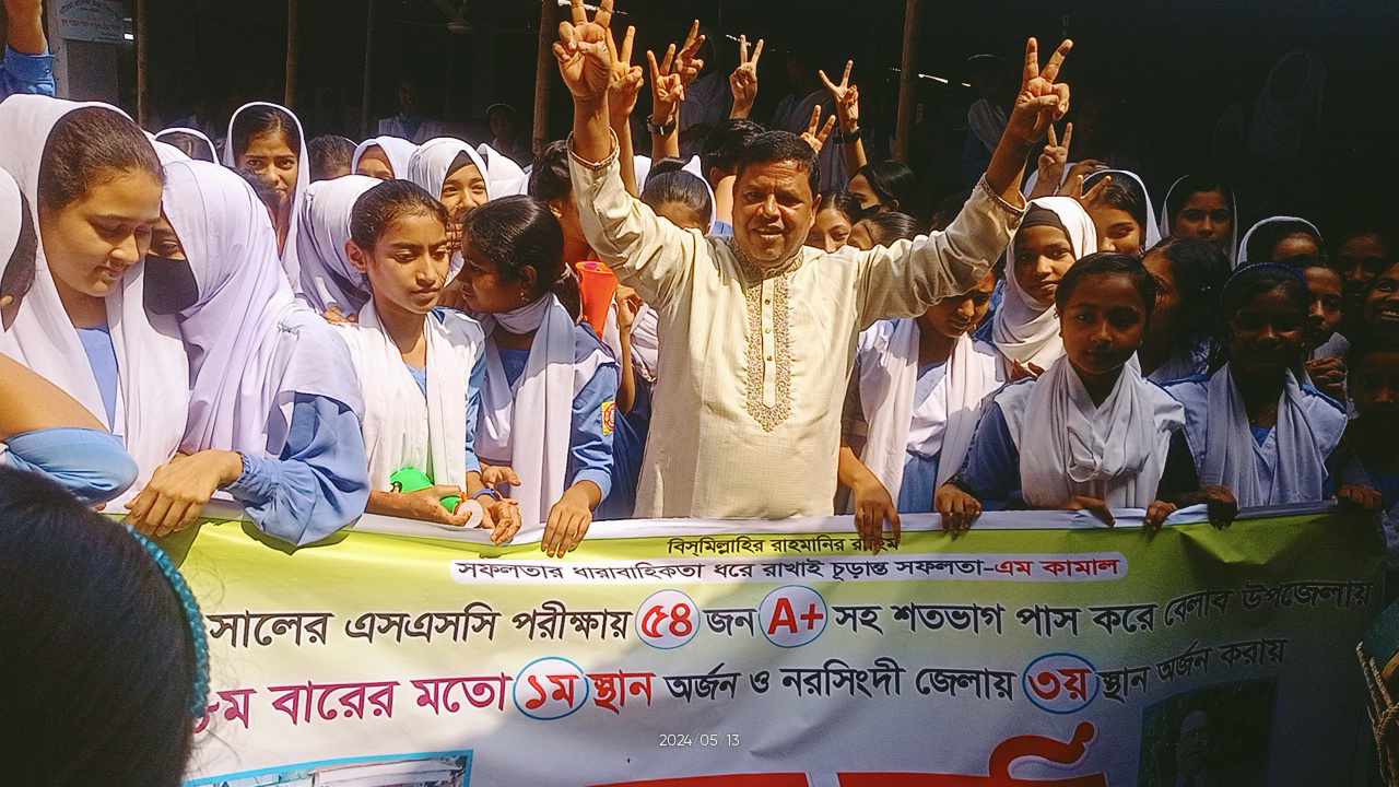 শাহিনুর আক্তার, বেলাবো প্রতিনিধি: ২০২৪ সালের এসএসসির ফলাফলে নরসিংদীর বেলাব উপজেলায় ৮ম বারের মত ১ম হয়েছে বারৈচা বালিকা উচ্চ বিদ্যালয়। রবিবার (১২ মে) প্রকাশিত ফলাফলে ৫৪টি জিপিএসহ শতভাগ উত্তীর্ণ হওয়ায় বিদ্যালয়ের সভাপতি শিল্প মন্ত্রীর সহধর্মিণী নাদিরা মাহমুদের নির্দেশনায় সোমবার ( ১৩ মে) সকাল ১০ টায় আনন্দ র্যালি করেছে বিদ্যালয় কর্তৃপক্ষ। র্যালিটি ঢাকা সিলেট মহাসড়ক বারৈচা বাসট্যান্ড হয়ে এ.এন.এম উচ্চ বিদ্যালয়সহ প্রধান প্রধান সড়ক প্রদক্ষিণ শেষে বারৈচা বালিকা বিদ্যালয়ে এসে শেষ হয়।